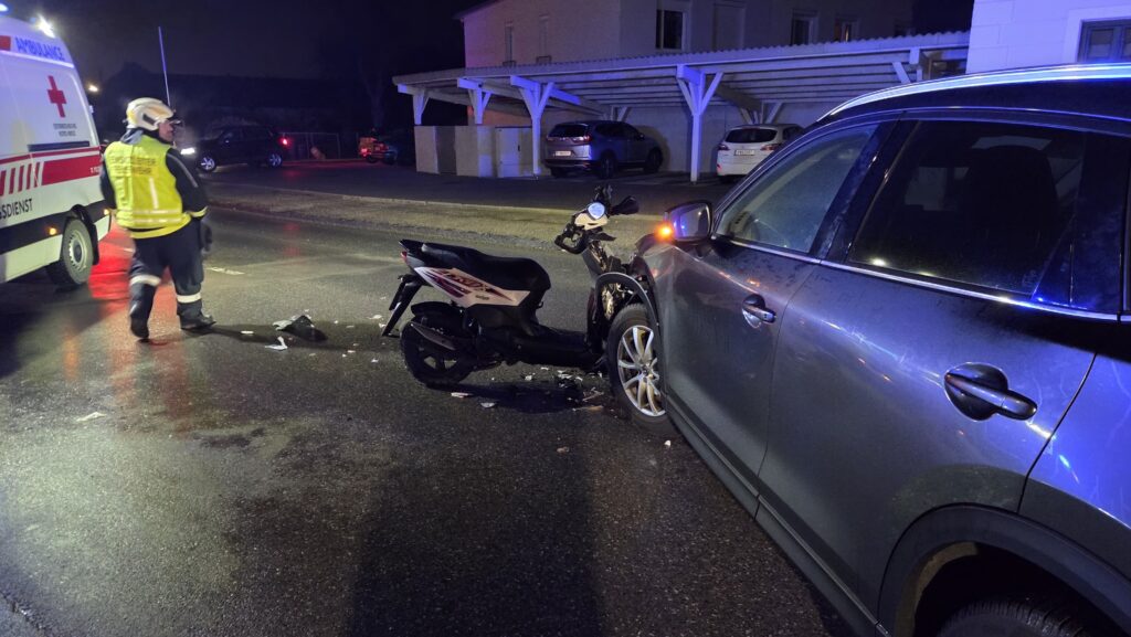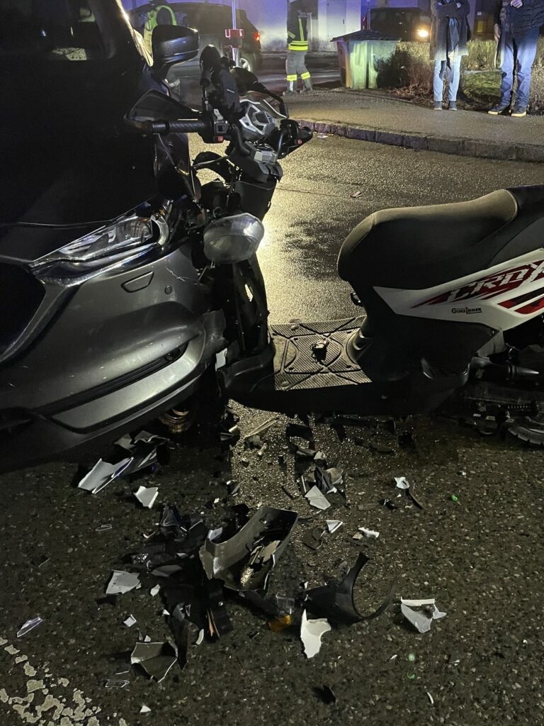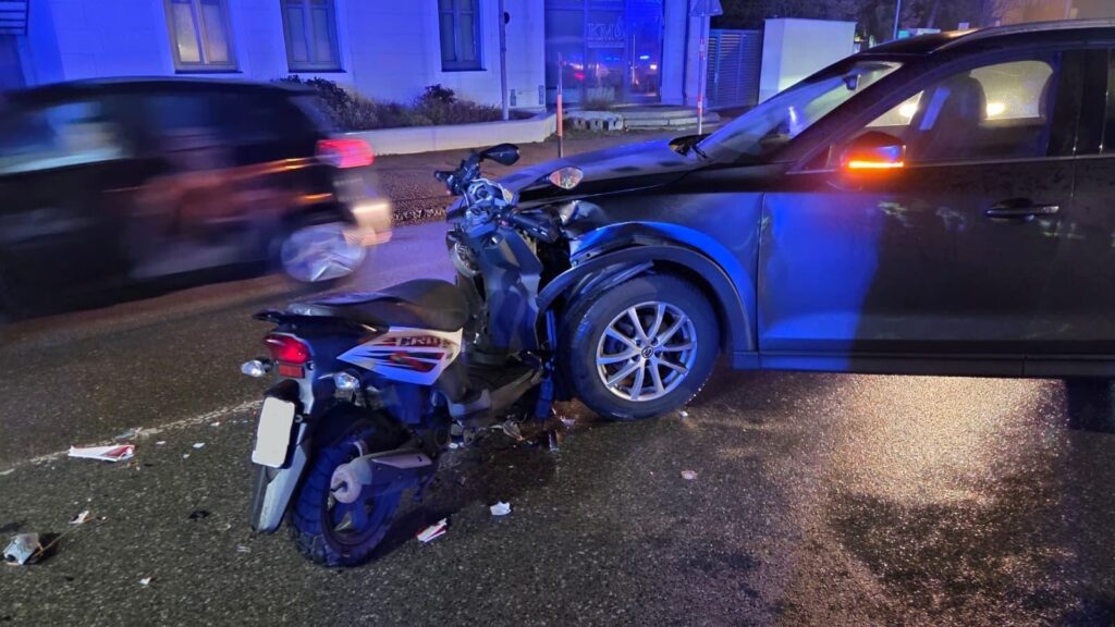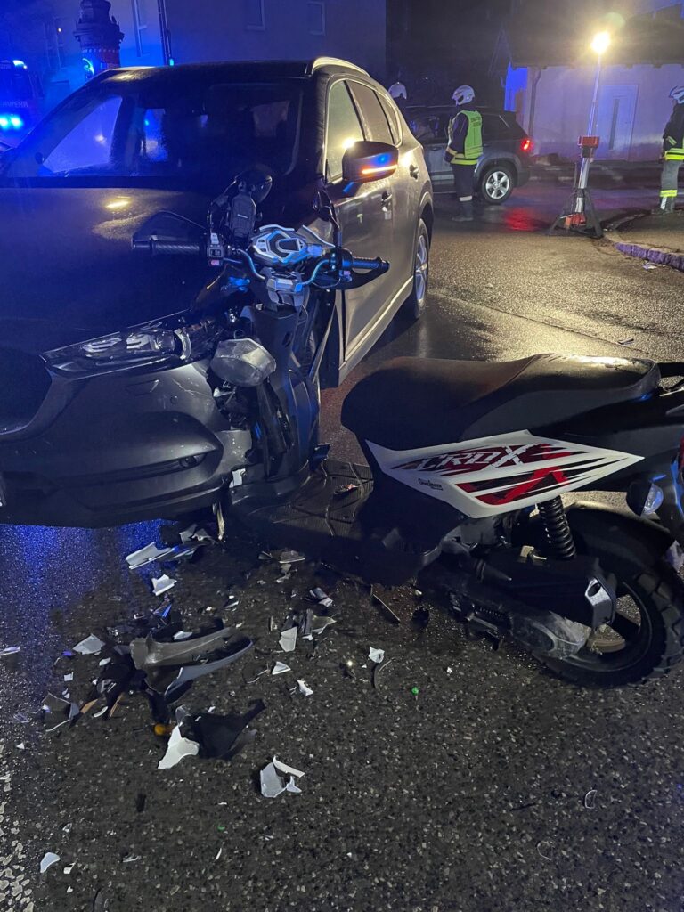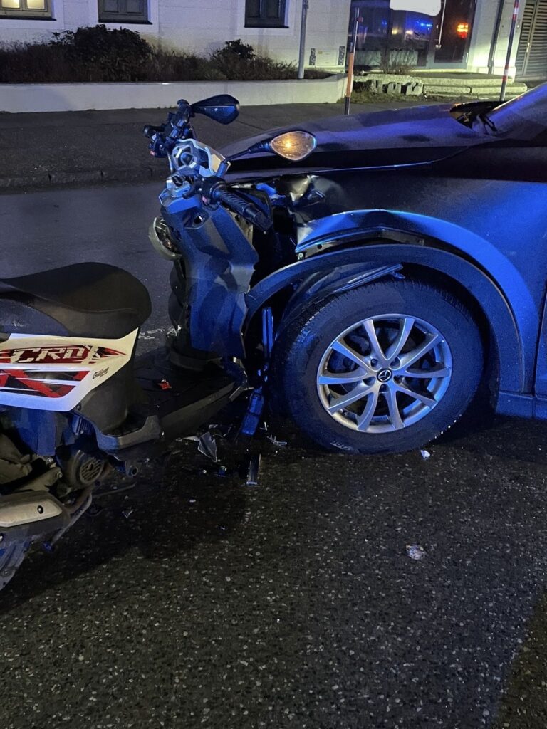 Am Morgen des 28.01. kam es im Ortsgebiet zu einer Kollision zwischen einem Motorroller und einem PKW. Der Roller prallte frontal gegen die linke Fahrzeugseite des PKW. Durch die Wucht des Aufpralls wurden zahlreiche Verkleidungsteile abgerissen und über die Fahrbahn verteilt.